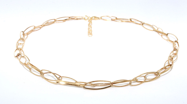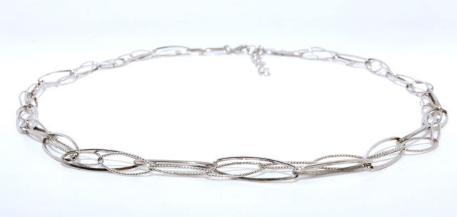 Diese außergewöhnliche Halskette besticht durch ihr raffiniertes Design aus zwei ineinander geschlungenen Ketten. Eine Kette mit ca. 1,5 cm großen Gliedern bildet die Basis, durch deren jedes zweite Glied sich eine feingliedrigere Kette mit ca. 1 cm großen Gliedern kunstvoll hindurchzieht. Das Zusammenspiel der unterschiedlich großen Glieder verleiht der Kette eine spannende, moderne Struktur und zugleich einen Hauch von Eleganz.