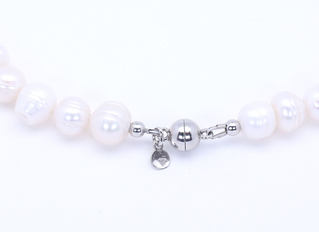 Diese edle Süßwasserperlenkette verkörpert feminine Raffinesse und zeitlose Schönheit. Jede Perle misst etwa 8–10 mm und begeistert durch ihren sanften, natürlichen Schimmer. Mit einer Länge von 48 cm schmiegt sich die Kette anmutig um den Hals und betont die Eleganz ihrer Trägerin. Der handgeknüpfte Seidenfaden verleiht Stabilität und fließende Beweglichkeit, während der rhodinierte 925 Silber-Magnetverschluss mit 8 mm Durchmesser stilvoll glänzt und höchsten Tragekomfort bietet. Diese Kette ist geschaffen für die selbstbewusste Frau, die Qualität, Stil und Ausdruck liebt – ein Schmuckstück von bleibender Klasse und erlesener Schönheit.