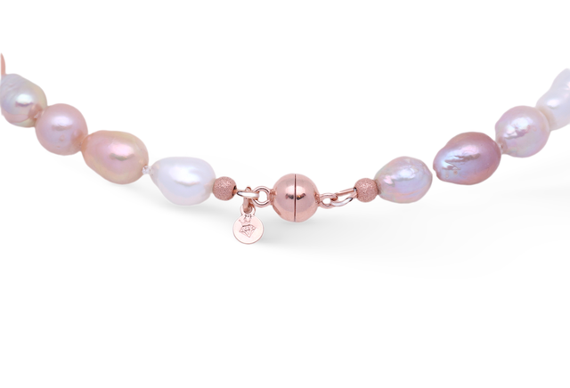Die etwa 1 cm großen, unregelmäßig geformten Perlen begeistern mit einem sehr edlen Lüster und natürlicher Schönheit. Unterschiedliche Rosatöne verleihen dem Schmuckstück eine warme, feminine Ausstrahlung.