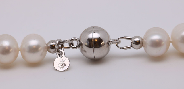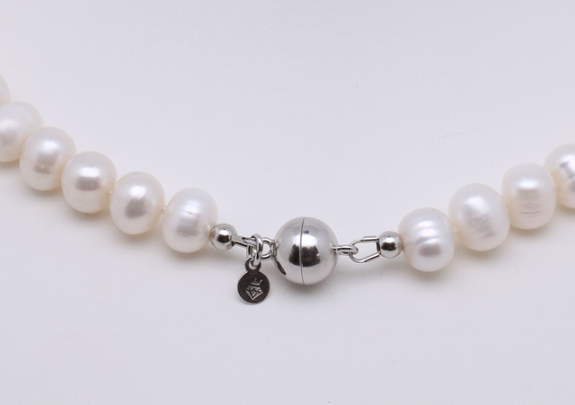 Diese edle Halskette aus weißen Süßwasserperlen verkörpert pure Klassik und feminine Raffinesse. Die rund 7 mm großen, zart schimmernden Perlen strahlen in einem eleganten Weißton und verleihen jedem Outfit eine luxuriöse Note. Mit einer Länge von 45 cm liegt die Kette perfekt am Hals und unterstreicht stilvoll Dekolleté und Ausdruck. Der praktische Magnetverschluss aus rhodiniertem 925er Silber sorgt für sicheren Halt und müheloses Anlegen – eine moderne Ergänzung zum traditionellen Design. Ein Schmuckstück von zeitloser Schönheit, das Anmut, Stil und höchste Handwerkskunst vereint – ideal für jeden Anlass, ob festlich oder elegant im Alltag.