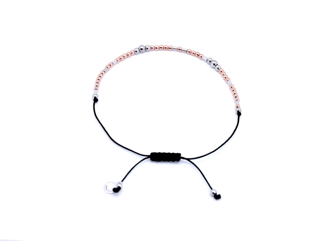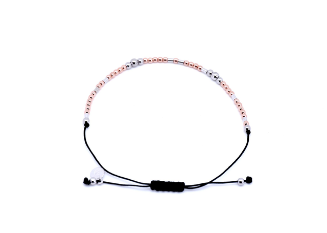Auf einem exklusiv gefertigten Band, das für die Herstellung von Schmuck konzipiert wurde, reihen sich 925 rhodinierte und rosévergoldete Elemente aneinander. Diese coolen Teile tragen in Morse-Schrift die Botschaft „Liebe dich selbst“.