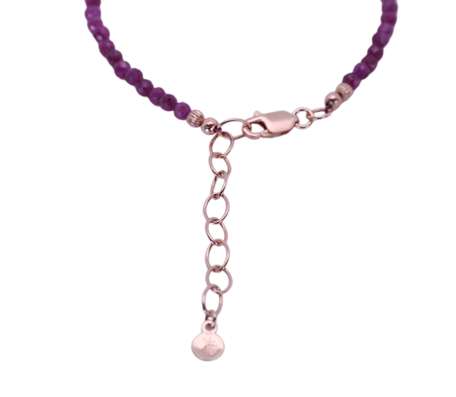 Dieses elegante Rubinarmband vereint feine Handwerkskunst mit ausdrucksstarker Farbe. Facettierte Rubine mit einem Durchmesser von 3 mm schimmern in satten Rottönen und verleihen dem Schmuckstück eine lebendige, feminine Ausstrahlung. Die Edelsteine sind harmonisch aneinandergereiht und werden von zarten Randkugeln aus rosévergoldetem 925er Silber stilvoll ergänzt. Mit einer Länge von 17 cm und einer zusätzlichen 4 cm Verlängerung lässt sich das Armband individuell anpassen und angenehm tragen. Der hochwertige Verschluss sorgt für sicheren Halt. Ein edles Accessoire, das sowohl im Alltag als auch zu besonderen Anlässen einen dezenten, luxuriösen Akzent setzt und zeitlose Eleganz auf besonders feine Weise unterstreicht.