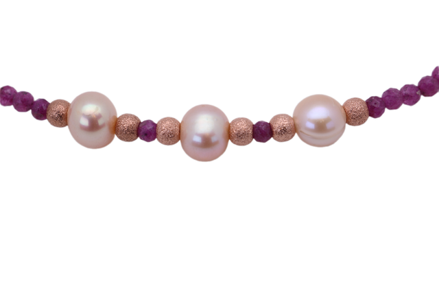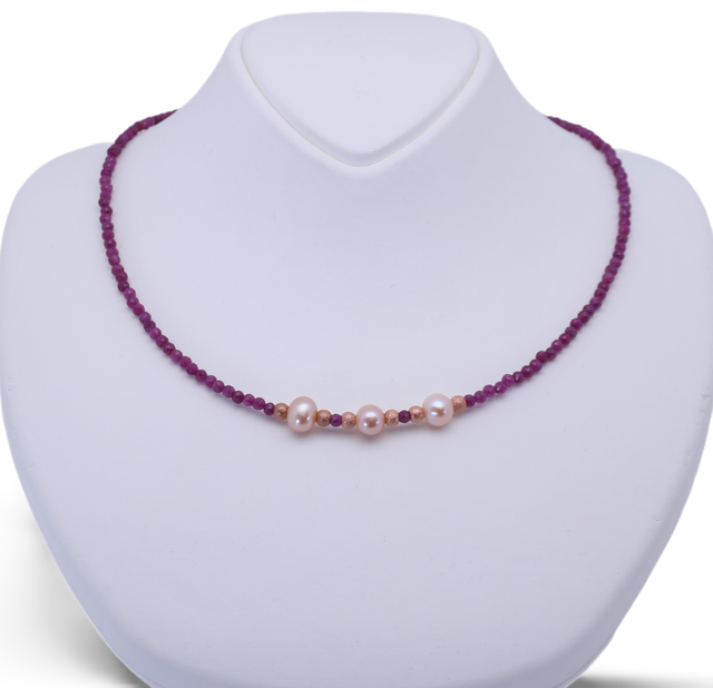 Dieses elegante Rubincollier vereint leuchtende Edelsteine mit zarter Perlenakzentuierung. Facettierte Rubine mit 3 mm Durchmesser ziehen sich harmonisch über die gesamte Kettenlänge und verleihen dem Schmuckstück ein intensives, lebendiges Funkeln. Im vorderen Mittelpunkt setzen drei ausgewählte Süßwasserperlen mit exzellentem Lüster einen edlen, ruhigen Kontrast. Zwischen den Perlen sitzt ein facettierter Rubin, der das Design fein auflockert und optisch verbindet. Links und rechts werden die Perlen von diamantierten 4 mm Kügelchen aus 925er Silber, rosévergoldet, stilvoll eingerahmt. Das Collier misst 42 cm und kann dank 5 cm Verlängerung individuell getragen werden. Ein romantischer Herzkarabiner aus rosévergoldetem 925er Silber sorgt für sicheren Halt und ein liebevolles Detail. Ideal für besondere Anlässe und als stilvoller Blickfang im Alltag getragen geeignet.