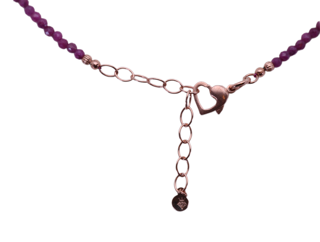 Dieses harmonische Collier setzt auf edle Farbe und feine Verarbeitung. Tiefrote, facettierte Rubine reihen sich zu einer zarten Kette, deren lebhafte Farbspiel das Licht auf elegante Weise einfängt. Die warm rosévergoldeten Elemente aus hochwertigem 925er Silber verleihen dem Schmuckstück einen luxuriösen, femininen Charakter und schaffen eine stilvolle Verbindung zwischen klassischem Edelstein und modernem Design. Als besonderes Detail dient ein dekorativer Herzkarabiner, der zugleich Verschluss und Blickfang ist.