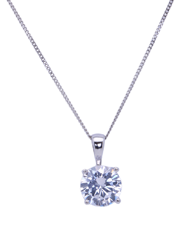 Hergestellt aus 925 rhodiniertem Silber und hochglanzpoliert. Der Stein ist ein 10 mm großer Zirkonia, der von vier Stiften gehalten wird. Die gesamte Länge des Anhängers beträgt 18 mm.