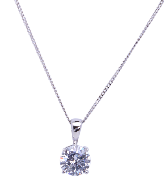 Hergestellt aus 925 rhodiniertem Silber und hochglanzpoliert. Der Stein ist ein 8 mm großer Zirkonia, der von vier Stiften gehalten wird. Die gesamte Länge des Anhängers beträgt 15 mm.