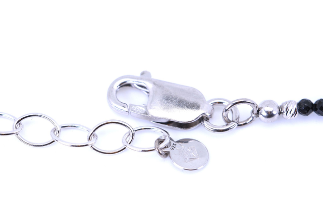 Diese edle Halskette bringt dezenten Glamour in deinen Look: Fein facettierte Spinell-Perlen (2 mm) in elegantem Schwarz reihen sich aneinander und funkeln geheimnisvoll im Licht. Gefasst ist die 42 cm lange Kette mit zusätzlicher 6 cm Verlängerung in hochwertigem, rhodiniertem 925 Silber – für langanhaltenden Glanz und Anlaufschutz. Ob solo getragen oder als Layering-Piece – dieses Schmuckstück verleiht jedem Outfit eine stilvolle Note. Ideal für besondere Anlässe oder deinen Alltags-Chic.