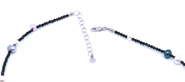 Diese außergewöhnliche Halskette kombiniert den edlen Glanz facettierter schwarzer Spinelle (2 mm) mit der natürlichen Schönheit echter Süßwasserperlen. In unregelmäßigen Abständen eingearbeitete bunte Perlen – von schimmerndem Weiß über Rosé bis hin zu zarten Pastelltönen – setzen elegante Farbakzente und machen diese Kette zum Unikat. Die Länge beträgt 40 cm, ergänzt durch eine 6 cm Verlängerung aus rhodiniertem 925 Sterling Silber. Diese Spinellkette lässt sich vielseitig tragen: solo als Blickfang oder im Layering-Look. Perfekt als moderne Perlenkette, eleganter Damenschmuck oder Geschenkidee. Ein zeitloses Schmuckstück, das Eleganz und Individualität auf stilvolle Weise vereint.