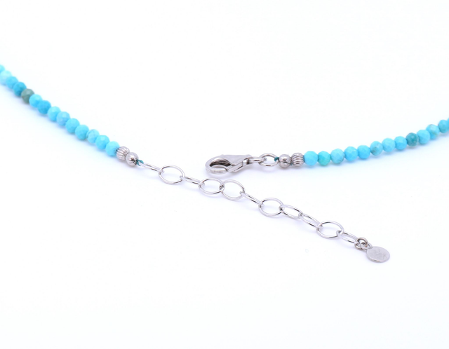 Dieses außergewöhnliche Collier begeistert durch seine liebevolle Handarbeit und fein abgestimmte Harmonie aus Farbe und Form. Kleine, 2,5 mm große Türkissteine verleihen dem Schmuckstück eine erfrischend lebendige Ausstrahlung, während rhodiniertes 925er Silber für edlen Glanz und dauerhafte Brillanz sorgt. Im Mittelpunkt stehen sechs polierte, gerillte Silberkugeln in sanft verlaufender Größe, zwischen denen ein tropfenförmiger, aquafarbener Kristallstein (ca. 6 x 9 mm) kunstvoll gefasst ist. Der Anhänger misst inklusive Schlaufe ca. 16 mm in der Länge und 6 mm in der Breite. Mit einer Länge von 43 cm plus 6 cm Verlängerung schmiegt sich dieses handgefertigte Collier elegant an – ein echtes Schmuckstück mit Persönlichkeit und Ausdruckskraft.